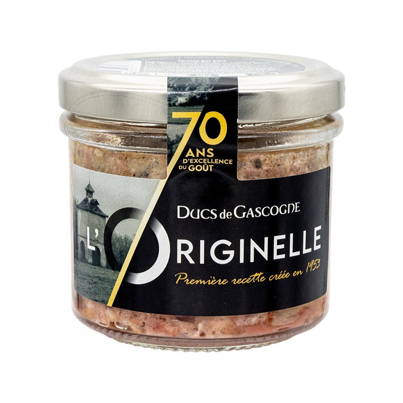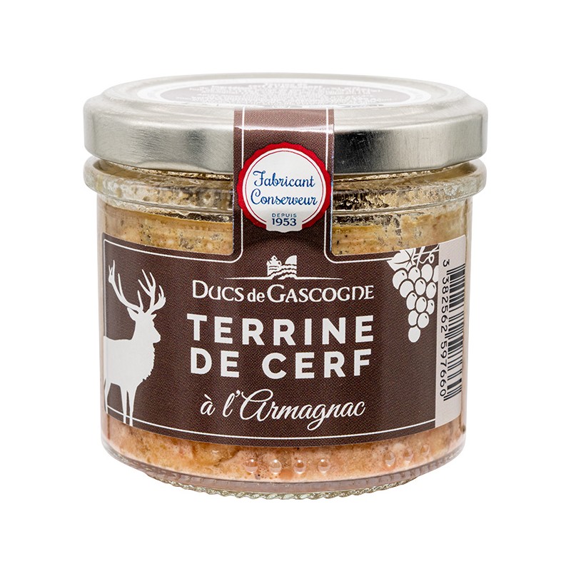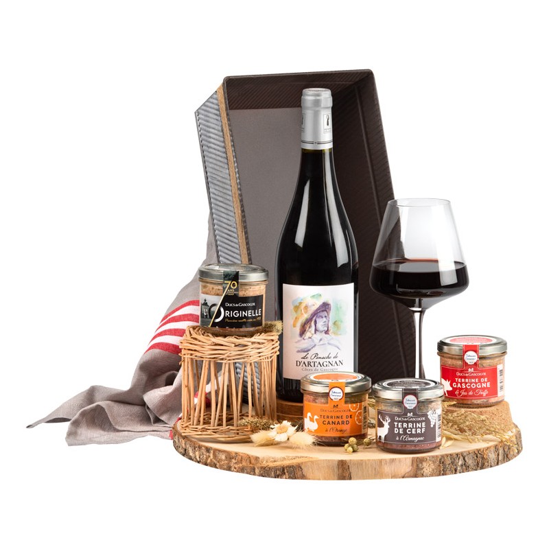 "L'originelle" terrine pur porc 90g : Porc 87,6% : Gorge de porc origine UE, foie de porc, gras de porc, couenne de porc, carotte, oignon, sel, épices Terrine de Gascogne et jus de truffe 90g : Porc (87,5%) origine UE (gorge, foie, gras), œuf, sel, jus de truffe brumale (1%), poivre Terrine de canard à l'orange 90g : Parure de canard (31%), foie de poulet, viande de canard origine UE (21%), œuf, zeste d'orange (4%), sel, gélatine bovine, poivre Terrine de cerf à l'Armagnac 90g : Viande de cerf (25%), gras de porc (23%), gorge de porc origine UE (16%), foie de porc (13%), viande de porc origine UE (12%), Armagnac (2%), sel, épices Panache de d'Artagnan domaine Malartic IGP Côtes de Gascogne rouge 75cl : 50% Merlot 50% Tannat