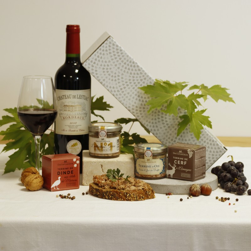 viande de sanglier origine UE (25%), gras de porc, viande de porc origine France, gorge de porc origine France, foie de porc, eau, airelle origine UE (3%), sel, ARMAGNAC, pulpe d’échalote (échalote, acidifiant : acide citrique, conservateur : disulfite de sodium), épices.