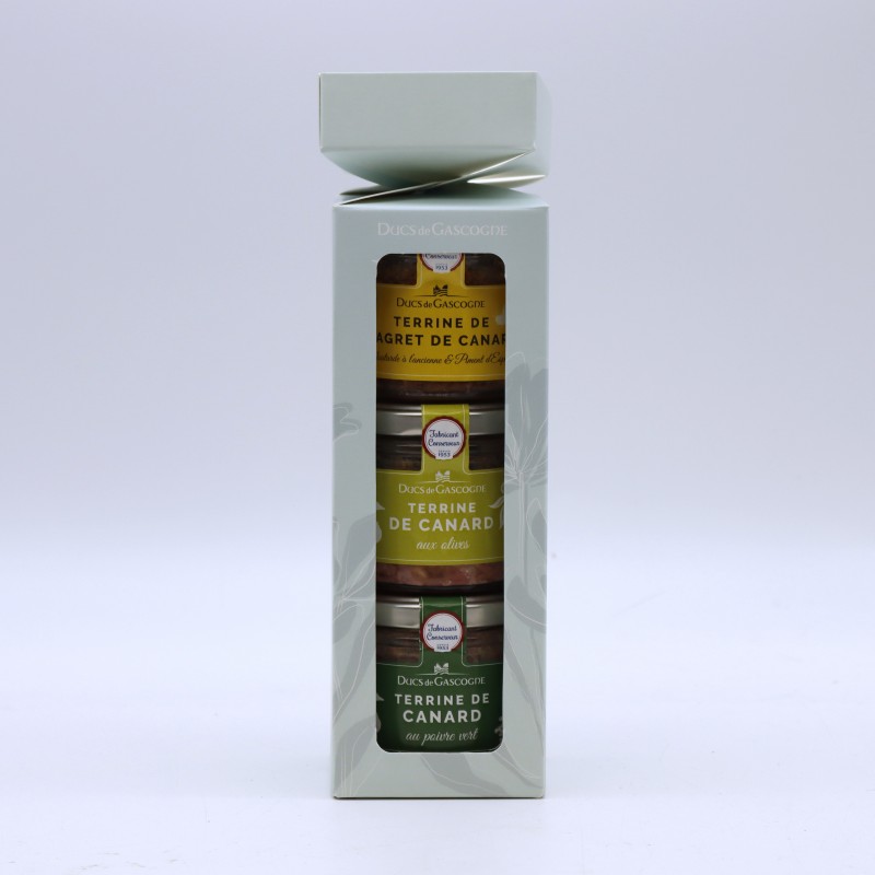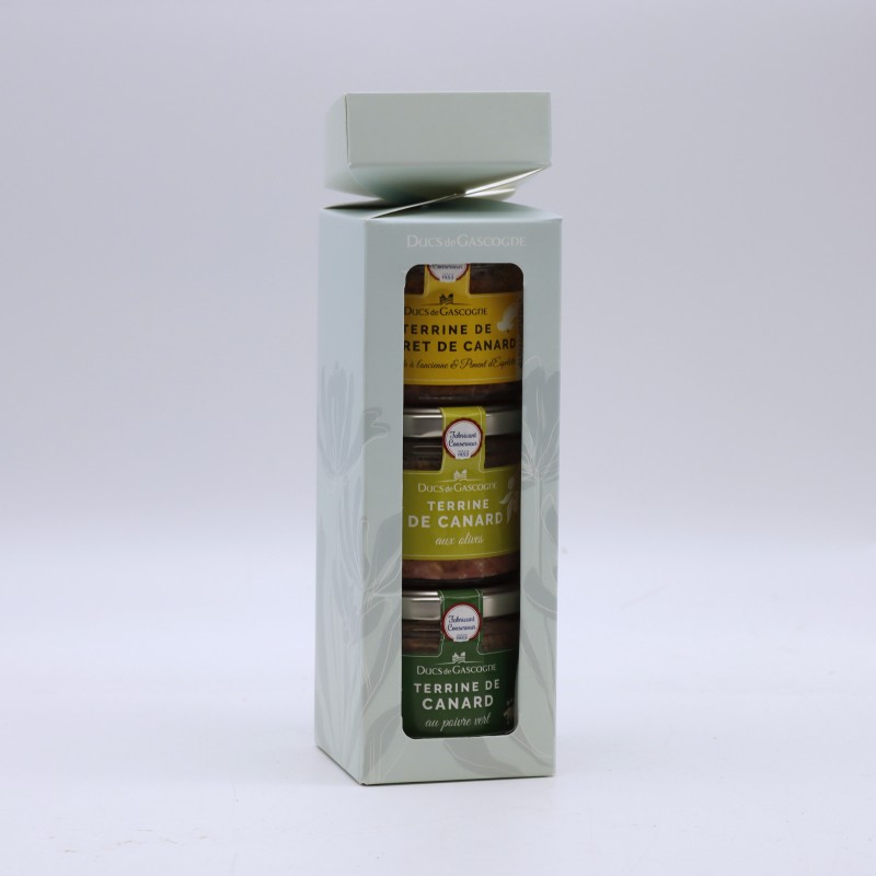 Viande de canard origine France (25 %), foie de poulet, gras de porc, gorge de porc origine France, olives vertes origine UE/non UE (11,7 %), ŒUF, VIN BLANC, sel, épices.