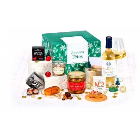 Box personnalisée fêtes fond vert (24 x 24 x 18 cm) : couché 180g / cannelure B / Test blanc 100g Sac cabas illustré en PP tissé laminé "70 ans" (44x35x22cm) : Dimensions : H44 x 35 + 22 cm (tolérance +/-1cm). Matière : polypropylène tissé 140g/m². Lamination extérieure (mate ou brillante à définir, pas de lamination intérieure). Rabas intérieur cousu en partie supérieure de 35 mm. 2 anses espacées de 12 cm, 57 x 3,5cm, fixées au corps du sac par deux piqures parallèles et deux piqûres en croix . Impression quadri sur le pourtour, 2 clr sur le fond du sac// 2 designs différents Terrine recette Gasconne au foie de canard (20% foie gras) 65g : Gorge de porc origine UE (40%), foie de porc (20%), foie gras de canard origine UE (20%), gras de porc, couenne de porc, carotte, oignon, alcool, sel, épices, sucre, antioxydant: acide ascorbique, conservateur: nitrite de sodium. Terrine de Noël aux cèpes 90g : Gorge de porc (origine UE), foie de porc, gras de porc, cèpe cuisiné (4 % : cèpe (Boletus Edulis, Aereus, Pinicola, Reticulatus), huile de tournesol), oignon, sel, épices. N°2 - L'authentique terrine de canard 65g : Viande de canard origine UE (25%), gras de porc, gorge de porc origine UE, foie de poulet, œuf, vin blanc, sel, pulpe d'échalote (échalote, acidifiant : acide citrique, conservateur : disulfite de sodium), épices. épices. "L'originelle" terrine pur porc 65g : Porc 87,6% : Gorge de porc origine UE, foie de porc, gras de porc, couenne de porc, carotte, oignon, sel, épices. Délice de volaille aux épices de Noël et chataignes 300g : Eau, viande de poulet traitée en salaison 33% (viande de poulet, eau, amidon modifié de maïs, sel), châtaigne 16%, carotte, oignon, amidon modifié de maïs, miel, sucre, vinaigre balsamique ( vinaigre de vin, moût de raisin, colorant: E150d, SULFITES), vinaigre de vin rouge (vinaigre de vin rouge (SULFITES), conservateur: SULFITES acide de sodium), sel, épices 0.15%, épaississants : gomme xanthane et farine de graines de guar, poivreivre Carré cadeau de Noël praliné noisette lait 14g : Sucre 45.64%, NOISETTES 12.41%, graisses végétales 11.24% (noix de coco 2.25%, colza 2.25%, palme 2.25%, graine de palmiste 2.25%, tournesol 2.25%), pâte de cacao 9.22%, LAIT entier en poudre 8.92%, beurre de cacao 8.54%, dextrose 1.97%, LAIT maigre en poudre 1.41%, arôme naturel de vanille 0.33%, émulsifiant 0.33% (lécithine de SOJA 0.33%). Peut contenir des traces de : OEUFS, GLUTEN. Boule rouge Rudolf chocolat lait brownie 10g : sucre 36.52%, pâte de cacao 20.02%, huiles végétales 16.01% (palme 14.46%, colza 1.54%), LAIT entier en poudre 12.93%, beurre de cacao 12.76%, matière grasse LAITière anhydre 0.77%, émulsifiant 0.43% (lécithine de SOJA 0.43%), arôme naturel de vanille 0.31%, graisse de LAIT 0.26%. Peut contenir des traces de: OEUFS, GLUTEN, FRUITS A COQUE Mini cake aux fruits Bio 30g : Farine de blé*T80 (gluten), sucre de canne* blond, œufs entiers*, huile de colza*désodorisée, fruits* 12,5% [(raisins secs* 5,7%, écorces d'oranges confites* 4,3% (orange*, sucre*,sirop de riz*), écorces de citron confites* 2,3% (citron*, sucre*, sirop de riz*)], jaune d'œufs en poudre* réhydratés, sirop de sucre de canne* inverti, rhum*, gomme d’acacia*,caramel * (eau + sucre*), sel marin, poudres à lever (tartrates de potassium, carbonates de sodium), extrait d’orange*, extrait de vanille*. * : issu de l’agriculture biologique Croix Lavignac IGP Comté Tolosan blanc moelleux 37,5cl : vin+sulfites+ac ascorbique+ac sorbique