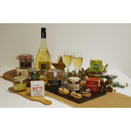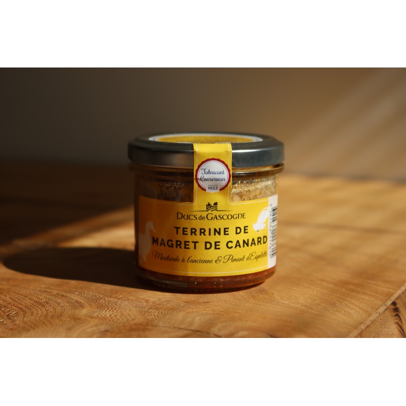 Terrine de magret de canard, moutarde à l'ancienne et piment d'Espelette 90g : Magret de canard (origine France) (30%), gorge de porc (origine France), gras de porc, viande de canard (origine France), foie de poulet, moutarde à l'ancienne (4,5% : eau, vinaigre d'alcool, graine de MOUTARDE, tégument de graine de MOUTARDE, sel, acidifiant : acide citrique, antioxydant : SULFITES, arômes, épice), couenne de porc, pulpe d'échalote, sel, crème fraîche (LAIT), pulpe d'ail, piment d'Espelette (0,3%), poivre.
