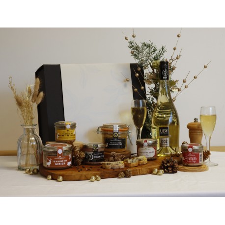 Terrine de gibier : Foie de porc (25%), gras de porc (20%), gorge de porc origine UE (19,1%), viande de cerf origine UE/Non UE (16%), viande de porc origine UE (6%), eau, Armagnac (2%), sel, épices.