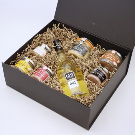 Terrine de Gascogne et jus de truffe 90g : Gorge de porc origine France, foie de porc, gras de porc, ŒUF, sel, jus de truffe brumale origine UE (1%), poivre.