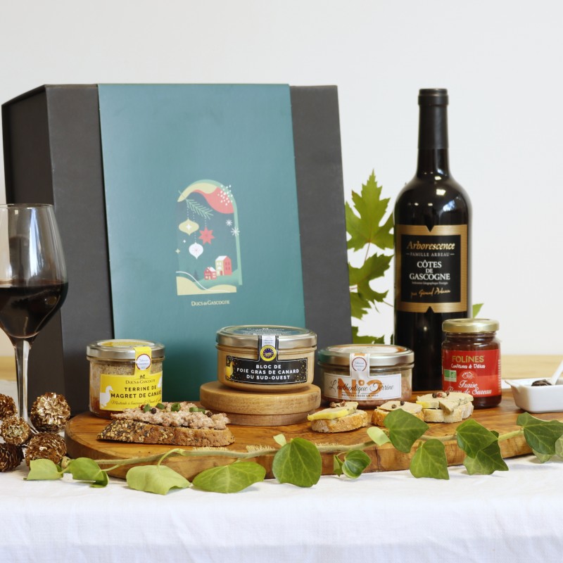 Présenté dans un coffret pliable noir signé Ducs de Gascogne, habillé d’un fourreau décoratif « Noël à la porte », il rassemble des spécialités emblématiques de la région. Le bloc de foie gras de canard du Sud-Ouest, véritable incontournable, s’accompagne d’une terrine de porc traditionnelle et d’une terrine de magret de canard relevée de moutarde à l’ancienne et piment d’Espelette. Pour compléter cet assortiment, une confiture de fraise à l’infusion de fleurs de sureau bio apporte une touche fruitée et raffinée. Enfin, une bouteille d’Arborescence rouge IGP Côtes de Gascogne vient parfaire cet ensemble, pour un accord mets et vins tout en authenticité.
