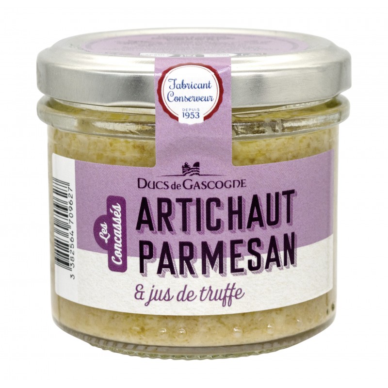 Artichaut (57%) (artichaut, acide citrique), huile de tournesol, eau, oignon, PARMESAN AOP (6%) (LAIT), jus de truffe (1,1%), pulpe d’AIL, sel, poivre