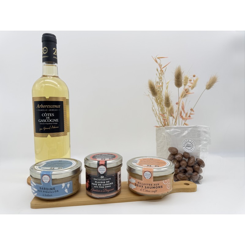 L’ensemble est sublimé par un vin blanc moelleux IGP Côtes de Gascogne (75 cl), aux notes fruitées et à la douceur équilibrée, parfait pour accompagner aussi bien les spécialités marines que les produits du terroir. Les amandes enrobées de chocolat au lait viennent conclure la dégustation sur une note gourmande et délicate.