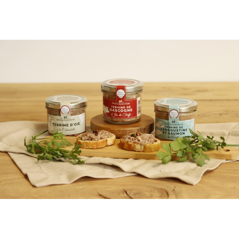Viande d'OIE origine UE (27%), gras de PORC, foie de POULET, foie de PORC, ŒUF, vin blanc (3% : Colombelle), sel, épices.