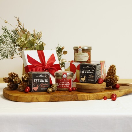 Foie gras de canard (20%), foie de poulet, graisse de canard, eau, crème fraîche (lait), jambon de Bayonne (10% : jambon, dextrose, conservateur : nitrate de potassium) (origine France), œuf, sel, sucre, piment d'Espelette. Foie gras de canard (20%), foie de poulet, graisse de canard, eau, crème fraîche (lait), cèpe (10% : cèpe, huile de tournesol), œuf, sel, sucre, poivre. Viande de canard origine UE (25%), foie de poulet, gras de porc, gorge de porc origine UE, œuf, figue 4% (figue séchée 95%, farine de riz 5%), sel, épices. Viande de canard origine UE (25%), gras de porc, gorge de porc, foie de poulet, œuf, vin blanc, sel, pulpe d'échalote (échalote, acide citrique, disulfite de sodium), épices.